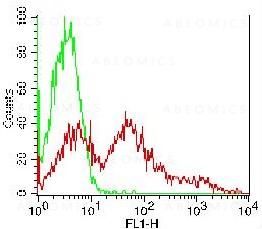 Fig.1: Cell surface staining of PBMC (lymphocytes gated). Green: FITC conjugated Isotope control (Abeomics). Red: FITC conjugated anti-HLADR (10-4181F), clone AB3. 0.2 µgantibodies were used.