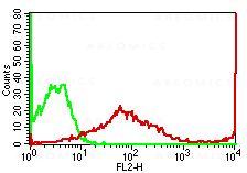 Fig:1-Cell surface flow analysis of HLADR in human PBMC using 0.5 µg/10^6 cells of HLADR antibody (Clone: L243). Green represents isotype control; red represents anti-HLADR antibody. Goat anti-mouse PE conjugate was used as secondary antibody.