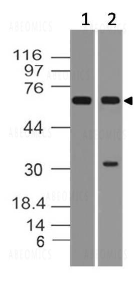 Fig-1: Western blot analysis of MAVS. Anti- MAVS antibody (Clone: ABM28C8) was tested at 2 µg/ml on Panc-28 and HCT116 lysates.