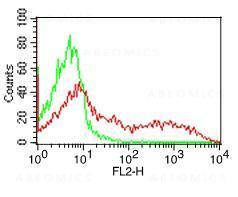 Fig-1: Cell Surface flow analysis of MHCII-DLADQ in PBMC (Lymphocyte gated) using 0.5 µg/10^6 cells. Green represents isotype control (ABEOMICS); red represents anti-hMHCII-HLADQ antibody (10-4134, clone:SPVL3). Goat anti-mouse PE conjugated secondary antibody (ABEOMICS) was used.