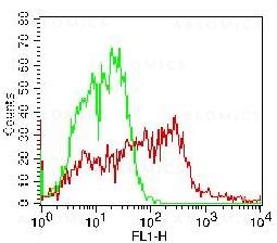 Fig-1: Cell Surface FLOW analysis of PD-L1 FITC in PHA treated human PBMC using 1 µg of FITC conjugated PD-L1 antibody (Clone: ABM4E54). Green represents isotype control (ABEOMICS); red represents anti-PD-L1 (10-7562-F) antibody.