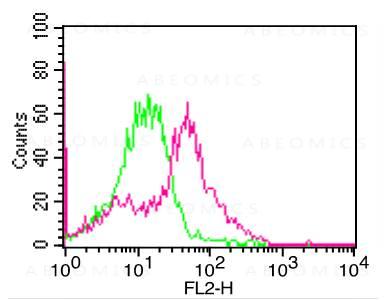 Fig:1- Cell Surface flow analysis of PD-L1 in 3 day-PHA treated human PBMC cells using 1 µg/10^6 cells of PD-L1 antibody (Clone: ABM5F25). Green represents isotype control; red represents anti-PD-L1 antibody. Goat anti-mouse PE conjugate was used as secondary antibody.