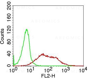 Figure 1: Intracellular staining of PBMC treated with PMA and Ionomycin. Green represents Isotope control (ABEOMICS). Red represents Anti-TNF alpha (10-4115). 1.0 µg antibody was used. Goat anti-mousePE was used as secondary.