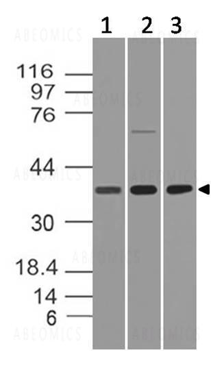 Fig-1: Western blot analysis of HtrA2. Anti-HtrA2 antibody (Clone: ABM1H83) was used at 4 µg/ml on hSpleen, HT-29 and hKidney lysates.