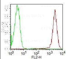 Figure. 1- Cell surface staining of Jurkat cells. Green represents IgG2a Isotype control (Abeomics), Red represents CD45 Clone EO-1 (10-4185). 0.1 µg antibody was used per test. PE conjugated Goat anti-mouse Ig was used as secondary antibody.