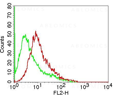 Fig-1: Cell surface flocytometry analysis of CD80 antibody in Raji cells using 2 µg 10^6 cells of Anti human CD80 (Clone:ABM40G8 ). Green represent isotype control and red represent Anti- CD80 antibody (ABEOMICS 10-4108). Goat anti-mouse PE conjugated was used as the secondary antibody.
