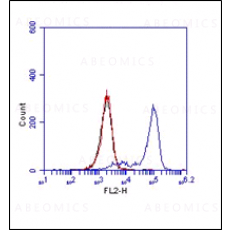 Fig. 1:Flow analysis of human/mouse TLR2 antibody (Clone:mT2.4): Cell surface staining of Raw cells, blue represents mouse TLR2, red represents Isotope control mouse IgG2b. 1:50 dilution of antibody was used. Goat Anti-mouse PE was used as secondary antibody.
