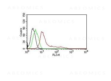 Flow Cytometry of Human Nuclear Antigen on MCF-7 Cells. Black: Cells alone; Green: Isotype Control; Red: PE-labeled HNA Monoclonal Antibody (235-1).