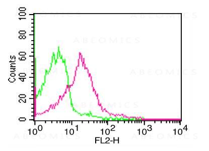 Figure-1: Cell Surface FLOW analysis of PD-L1 in PHA treated human PBMC using 1 µg of PD-L1 antibody (Clone: ABM4E54). Green represents isotype control; red represents anti-PD-L1 antibody. Goat anti-mouse PE conjugate was used as secondary antibody.