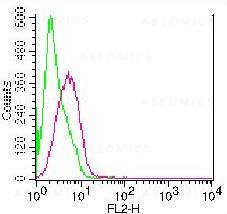 Figure1: Cell surface staining of CHO and CHO-IcosL cells (cat. 14-504ACL) using 0.5 µg of anti-ICOS ligand (cat. 10-7616) antibody. Green represents CHO cells, Red represents CHO-IcosL cells. Goat anti-mouse PE was used as secondary antibody.