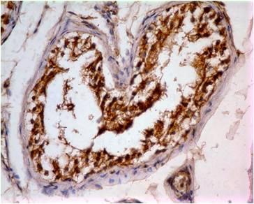 Fig-1 : Immunohistochemical analysis of IDH1 in human testis tissue using IDH1 antibody (Clone: ABM44B3) at 5 µg/ml.