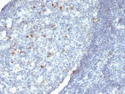 Formalin-fixed, paraffin-embedded human Tonsil stained with IgM Monoclonal Antibody (IM260 + IM373 + ICO-30)