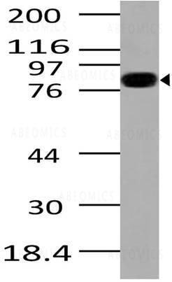 Fig-1: Western blot analysis of IKKb. Anti- IKKb antibody (Clone: ABM10E6) was used at 2 µg/ml on Raji lysate.