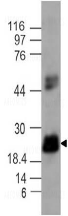 Figure-1: Western blot analysis of IL-17C. Anti- IL-17C antibody (Clone: ABM2H52) was tested at 2 µg/ml on A549 cell lysate.