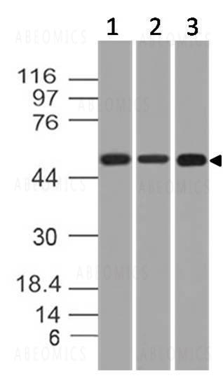 Fig:1- Expression analysis of KRT76. Anti-KRT76 antibody (Clone: ABM51A8) was tested at 0.5 µg/ml on Hela, MCF7 and A431 lysates.