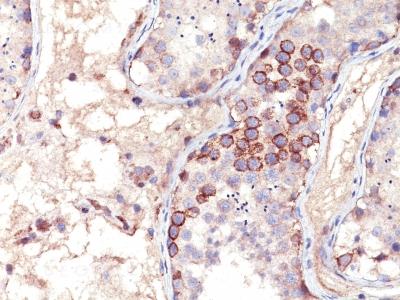 Formalin-fixed, paraffin-embedded human Testis stained with MAGE-1 Monoclonal Antibody (MA454).