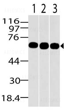 Fig-1: Western blot analysis of MBD1. Anti-MBD1 antibody (Clone: ABM15H2) was used at 2 µg/ml on HepG2, MCF7 and A431 lysates.