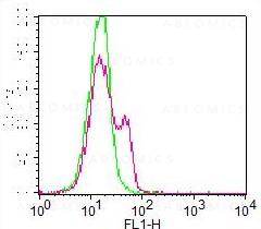 Fig-1: Intracellular FLOW staining of PMA treated Jurkat cells using 0.5 µg of antibody. Green represents FITC conjugated isotype control (Abeomics). Red represents FITC conjugated MBD1 (10-7007-F).