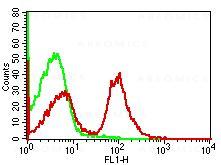Fig:1- Cell surface flow analysis of mCD19 in mouse splenocytes using 0.5 µg/10^6 cells of mCD19 antibody (Clone: 1D3). Green represents isotype control; red represents anti-mCD19 antibody (10-4006). Goat anti Rat FITC conjugate was used as secondary antibody (ABEOMICS).