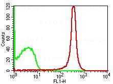 Fig:1-Cell surface flow analysis of mCD4 FITC cojugated in Mouse thymocytes using 0.5 µg/10^6 cells of mCD4 antibody (Clone: GK1.5). Green represents isotype control; red represents anti-mCD4 FITC antibody (10-4092F).