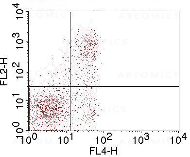 Figure-1: Cell surface flowcytometric staining of mFR4 (Clone: TH6) in mouse Thymocytes. Mouse Thymocytes were first stained with Anti-mCD3 APC conjugated, mCD3 APC positive cells were gated and further analyzed for mFR4 using 0.5 µg/10^6. Goat anti-Rat PE secondary antibody (ABEOMICS) was used.