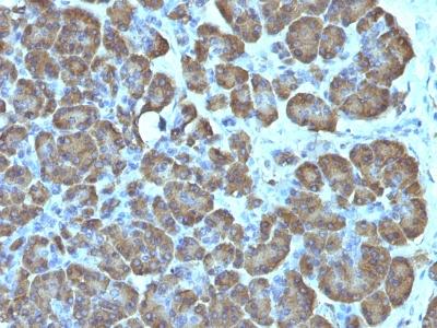 Formalin-fixed, paraffin-embedded human Pancreas stained with Mitochondria Monoclonal Antibody (SPM198).