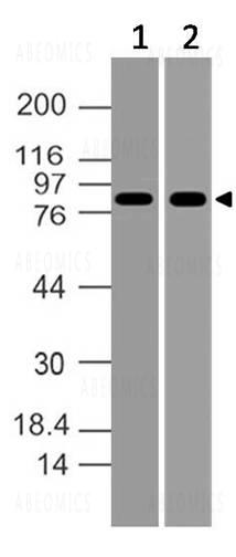 Figure-1: Western blot analysis of MLH1. Anti- MLH1 antibody (Clone: ABM17C1) was used at 4 µg/ml on (1) MCF-7 and (2) Raji lysates.