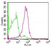 Figure-1: Cell surface flow analysis of mouse CD155 on C57 mice splenocytes using 0.5 µg/10^6 cells of CD155 antibody (Clone: 4.24). Green represents isotype control; red represents anti-mouse CD155 antibody. mouse anti-rat Fitc conjugate was used as secondary antibody.