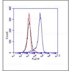 Fig. 1: Flow analysis of CD180 antibody (Clone: RP/14): Cell surface staining of Raw cells, blue represents mouse CD180, red represents Isotope control Rat IgG2a. 1:50 dilution of antibody was used. Goat Anti-Rat PE was used as secondary antibody.