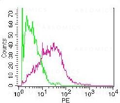 Figure 1: Cell surface staying of splenocytes stimulated with ConA + mIL2 for 3 days. Green represents Rat isotope control, red represents Anti-mouse Icos (10-7642). 0.2 µgantibodies were used. Goat anti-rat PE was used as secondary antibody.