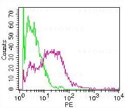 Figure 1: Cell surface staying of splenocytes stimulated with ConA + mIL2 for 3 days. Green represents Rat isotope control, red represents Anti-mouse IcosL(10-7643). 0.2 µgantibodies were used. Goat anti-rat PE was used as secondary antibody.