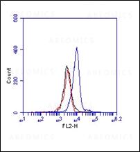 Figure-1: Flow analysis of mouse MD-1 antibody (Clone: MD113): Cell surface staining of Raw cells, blue represents mouse MD-1, red represents Isotope control Rat IgG2b. 1:50 dilution of antibody was used. Goat Anti-Rat PE was used as secondary antibody.