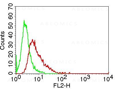 Figure-1: Intra cellular flow analysis of Msi-2 on HeLa cells using 2 µg/10^6 cells of Msi-2 antibody (Clone: ABM5A48). Green represents isotype control; red represents anti-Msi-2 antibody. Goat anti-mouse PE conjugate was used as secondary antibody.