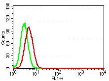 Figure-1:Intra cellular Flow analysis of mTIM-3 in Raw cells using 1 µg/10^6 cells of mTIM-3 antibody (Clone: ABM3F21). Green represents isotype control; red represents anti-mTIM-3 antibody. Goat anti-Rat FITC conjugate was used as secondary antibody.