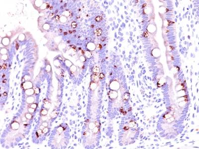 Formalin-fixed, paraffin-embedded human Intestine stained with MUC2 Monoclonal Antibody (CCP58).