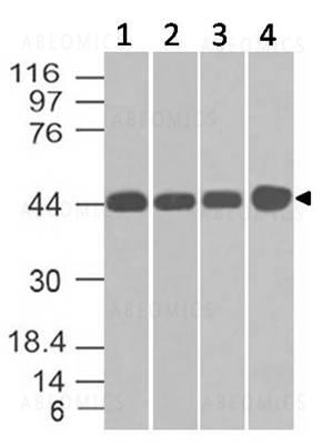 Fig:1- Expression analysis of NDRG1. Anti-NDRG1 antibody (Clone: ABM51C9) was tested at 4 µg/ml on (1) h Intestine, (2) h Ovary, (3) A431 and (4) HCT-116 lysates.