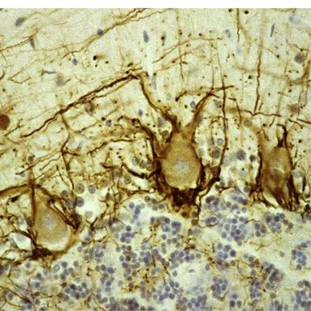 Figure-1: Immunohistological analysis of human cerebellar cortex section stained with mouse mAb to pNF-H, (34-1077), in brown. Paraffin-embedded, formalin-fixed tissue sections were stained with this antibody using the avidin biotin conjugate method. The sections was counterstained with Hematoxylin in blue. (34-1077) stains prominent basket cell axons surrounding the large Purkinje neurons. Cerebellar granule cell layer is at the bottom of the image, the molecular layer at the top.
