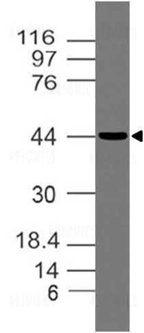 Fig-1: Western blot analysis of OPG. Anti-OPG antibody (Clone: ABM10D2) was used at 4 µg/ml on Hela lysate.