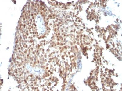 Recognizes a 53kDa protein, which is identified as p53 suppressor gene product. It reacts with the mutant as well as the wild form of p53. Its epitope maps within the N-terminus (aa 37-45) of p53. p53 is a tumor suppressor gene expressed in a wide variety of tissue types and is involved in regulating cell growth, replication, and apoptosis. It binds to MDM2, SV40 T antigen and human papilloma virus E6 protein. Positive nuclear staining with p53 antibody has been reported to be a negative prognostic factor in breast carcinoma, lung carcinoma, colorectal, and urothelial carcinoma. Anti-p53 positivity has also been used to differentiate uterine serous carcinoma from endometrioid carcinoma as well as to detect intratubular germ cell neoplasia. Mutations involving p53 are found in a wide variety of malignant tumors, including breast, ovarian, bladder, colon, lung, and melanoma.