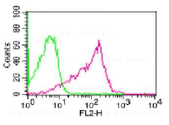 Figure-1:Intra cellular Flow analysis of P65 in human PBMC using 0.5 µg/10^6 cells of P65 antibody (Clone: ABM1A16). Green represents isotype control; red represents anti-P65 antibody. Goat anti-mouse PE conjugate was used as secondary antibody.