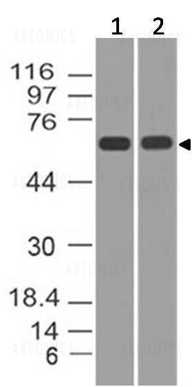Fig-1: Western blot analysis of p73. Anti-p73 antibody (Clone: ABM1G28) was used at 2 µg/ml on 293 and NCCIT lysates.
