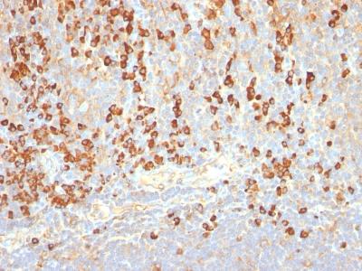 Formalin-fixed, paraffin-embedded human Tonsil stained with Plasma Cell Marker Monoclonal Antibody (LIV3G11).