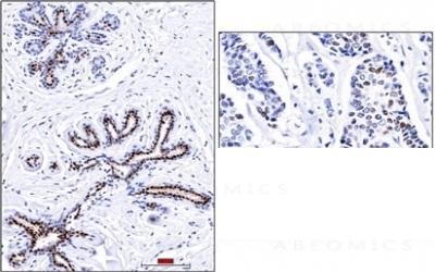 Formalin-fixed, paraffin-embedded normal human Breast (left) and Invasive Ductal Carcinoma (right) stained with progesterone receptor Ab (PR501).