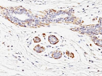 Formalin-fixed, paraffin-embedded human Breast Carcinoma stained with SM-MHC Monoclonal Antibody (MYH11/923).
