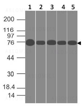 Figure-1: Western blot analysis of SPARCL1. Anti-SPARCL1 antibody (Clone: ABM5C3.2G1) was used at 1 µg/ml on (1) MCF-7, (2) A549, (3) HT-29, (4) HCT-116 and (5) PANC-1 lysates.