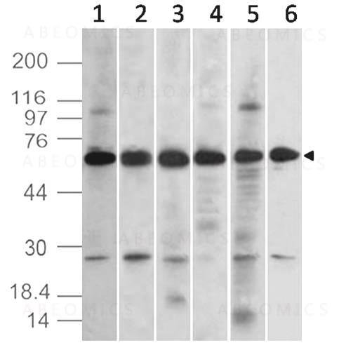 Figure-1: Western blot analysis of TEM7. Anti-TEM7 antibody (Clone: ABM1D82) was used at 2 µg/ml on (1) BT474, (2) MCF-7, (3) SKBR3, (4) A549, (5) Jurkat and (6) HepG2 lysates.