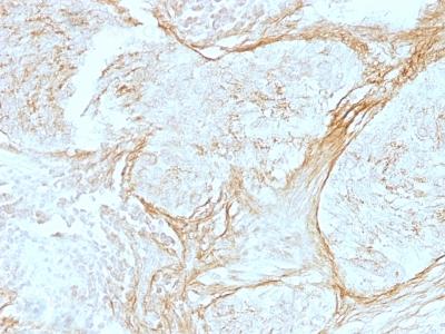 Formalin-fixed, paraffin-embedded human Lung Carcinoma stained with Tenascin C Monoclonal Antibody (SPM319) at 4ug/ml. Antigen retrieval in 10mM Tris with 1mM EDTA, pH 9.0; ABC detection system with DAB Chromogen. Note staining of connective tissue.