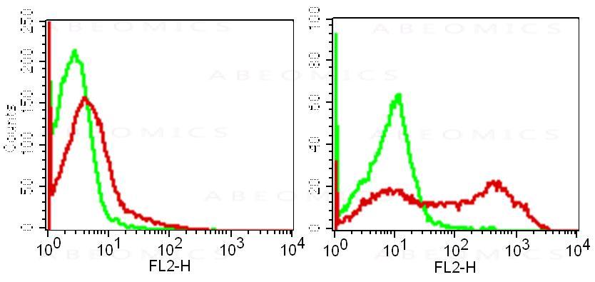 Figure-1: Cell surface flow cytometry analysis of human TIM-3 in PHA stimulated PBMC (Lymphocytes) using 0.5 µg/10^6 Cells of Anti-TIM-3 (Clone: ABM31A8) in Right and unstimulated PBMC is shown in Left. Green represent isotype control and Red represent Anti-TIM-3 antibody (ABEOMICS, 10-4076). A goat anti-mouse PE-conjugated secondary antibody was used.