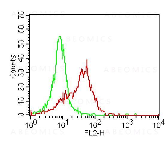 Fig-1: Intracellular flow analysis of TLR2 PE conjugated in PBMC (Monocytes) using 0.5 µg/10^6 cells of TLR2 PE conjugated antibody (Clone: ABM3A87). Green represents isotype control; red represents anti-TLR2 PE conjugated antibody.
