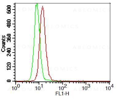Fig-1: Intracellular flow analysis of TLR3 FITC conjugated in THP-1 cell line using 0.5 µg/10^6 cells of TLR3 FITC conjugated antibody (Clone: ABM15D5). Green represents isotype control; red represents anti-TLR3 FITC conjugated antibody.